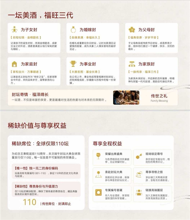 2.立足健康发展大势,封坛窖藏沉淀酒体品质,契合健康饮酒理念,赋能酱香价值升级。3.以专属纪念封坛为载体,凝聚匠人初心,成就稀缺典藏,续写百年酱酒文脉。】