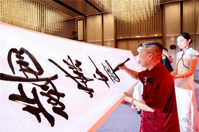 【图说:翰墨留香,文脉赋能,以国粹艺术厚植品牌文化底蕴文联直属中国书画家联谊会寿文化艺术委员会会长赵玉杰先生亲临现场,为大会赠送墨宝《九九廿十一天年寿》、《王茅陈酿香飘万里》